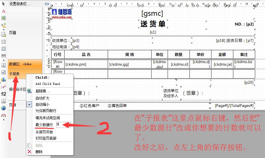第二步:在左側的”子報表“上,點鼠標右鍵,然后再把“最少數據行”改成你想要的行數,比如想只顯示5行,就改成5,改好之后點左上解的“保存”按鈕圖標。